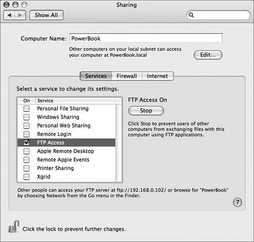 It may take a moment for Personal Web Sharing to start. When it does, the Start button changes to Stop, and the top of the window explains how other computers on your local subnet can access your computer. At the bottom of the window are similar instructions that are also applicable to local users, but intended primarily for users outside your local subnet. For these instructions to work properly, it may be necessary to enable port forwarding on your router, and that's beyond the scope of this book.