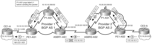 Verify control plane forwarding – Figure 7-29 shows the control plane forwarding operation when the 172.16.10.0/24 prefix is propagated across the multiprovider networks AS1 and AS2 to CE2-A. Figure 7-29. Verify Control Plane Forwarding Using Option 3