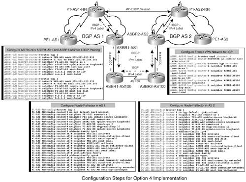 Figure 7-34 shows the configuration steps that are involved in accomplishing a functional Inter-AS network using option 4.
