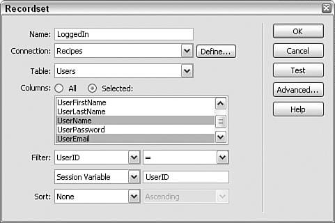 UserID | = (Equals) | Session Variable | MM_UserID |