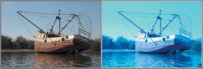 While both images now have a strong blue cast, you should see that the colors are still quite different. In the JPEG image, the blue cast doesn't go through all of the different color ranges as thoroughly as it does in the RAW file. In the JPEG image, the red on the bottom of the boat is much redder than in the RAW file. The same is true of the greens in the background.
