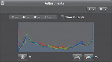 | Reading the Histogram The default histogram in the Adjustments HUD is a graph of the luminance values of all of the pixels in your image. However, you can change the histogram display to show graphs of other types of pixel data. 1. | Click the Adjustment Action pop-up menu in the upper right corner of the histogram (the one that looks like a small gear). Choose RGB from the Histogram Options section to reveal a histogram that shows separate graphs for each color channel.