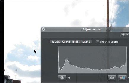 | 3. | Drag the pointer over the bright part of the sky. In the Adjustments HUD, note the RGB readout above the histogram. These numbers indicate how much of each color channel is used to make up the color of the pixel that you're mousing over.