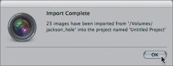 A new, untitled project appears in the Projects panel. An icon to the left of the untitled project provides animated feedback until the import is complete. When Aperture finishes importing the images, an Import Complete window appears. If there have been any problems, this window will provide details.