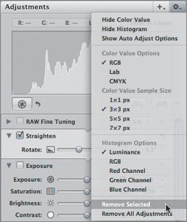 | | | 7. | Click the Adjustments Inspector's Action button and choose Remove Selected from the pop-up menu.