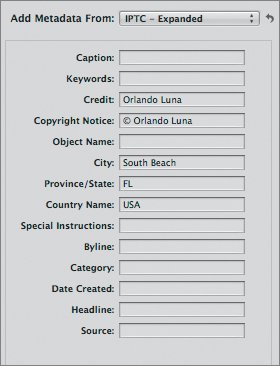 | 5. | Choose Add Metadata From > IPTC Expanded and then enter the following metadata: