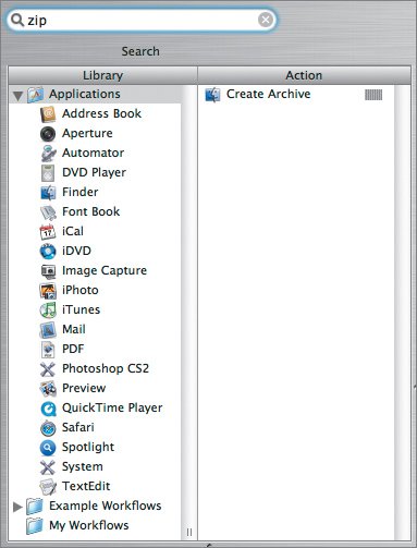 The Action pane shows the results. Most likely, you'll only have one entry, Create Archive. However, if you've installed any other applications that provide Automator support for file compression, then they'll appear here also.