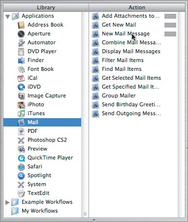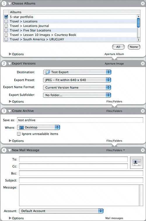 Note that our workflow is now running Mail instead of Aperture. You can move seamlessly from one application to another in a workflow without having to issue any special commands.