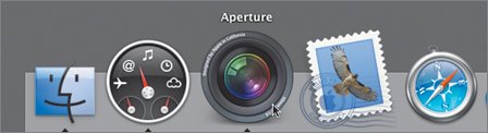 | There are three ways to open Aperture: By double-clicking the Aperture application icon By defining Aperture as your default image application and inserting a camera card or attaching a camera By clicking the Aperture application icon in the Dock Let's start by opening Aperture from the Dock. Adding Aperture to the Dock You can add Aperture to the Dock as you would any other Mac OS X application. 1. | Click the desktop to make sure you're in the Finder.