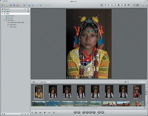 Note If this window did not appear, it may be because you've opened Aperture before and you previously checked the "Don't show again" box. To import the Tibet project manually, choose File > Import > Projects, navigate to Macintosh HD/Library/Application Support/Aperture/Sample Projects, select the Tibet project, and open it. Aperture adds the Tibet project to the Projects panel in the upper left corner of the Aperture main window, displays image thumbnails in the Browser at the bottom of the main window, and displays one large image in the Viewer in the center of the main window. Let's get acquainted with these and other aspects of the Aperture interface next.