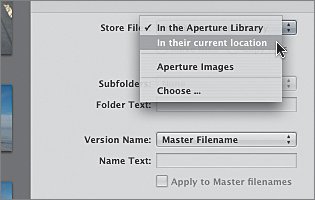 | 12. | Choose "In their current location" from the Store Files pop-up menu in the Import dialog.