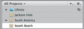 | | | 4. | Click the Library in the Projects panel to set it as the destination for your images. This way, Aperture will import the South Beach images into their own project.