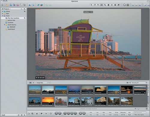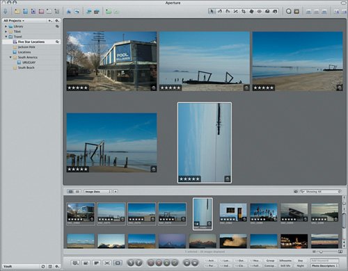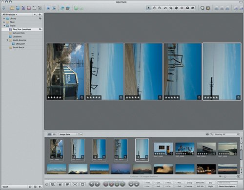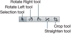 | Aperture offers a number of tools that help you frame images, which is an everyday task for many photographers. These tools, located on the center right of the toolbar, allow you to rotate, straighten, and crop images. Let's use them now to adjust the frames of some of our five-star location images.  Rotating a Single Image The Rotate tools allow you to change the orientation of your images. You can rotate clockwise (right) or counterclockwise (left) in 90-degree increments. You may need to rotate images, for example, if you held your camera in the portrait position to capture some shots and they were imported without adjustment. All of the images in our Smart Album are correctly oriented, but let's learn to rotate images using one of our South America shots. 1. | Click the Rotate Left tool to select it.