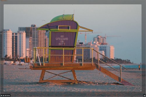 | | | 2. | Select the SoBe_2005 12 of 50 image in the Five Star Locations Smart Album in the Projects panel. It appears in the Viewer. This is a nice image, but there's a small bit of kite, or a flag, in the upper left corner that's a little distracting. And there's a bystander on the beach who interferes with the overall serenity of the image. So let's crop this image to remove those two unwanted elements.