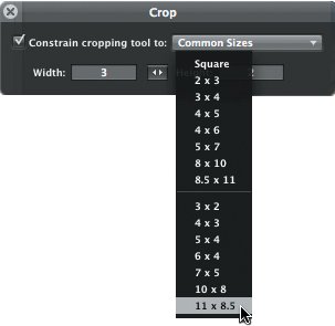 | 3. | In the Crop HUD, select the "Constrain cropping tool to" checkbox and then choose Common Sizes > 11 x 8.5.