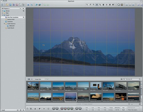 | Using the Crop Tool Cropping images is a basic task that photographers perform regularly. You can use cropping to remove an unwanted element from a frame or to create a dynamic shift in composition. In either case, you use Aperture's Crop tool. 1. | Press I to close the Adjustments Inspector.