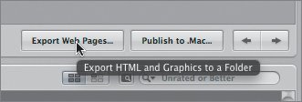 | When you're ready to publish a web journal, Aperture presents you with two options: You can export the webpages to HTML and save them on your hard disk, after which you can email the pages to a client, manually post them on a website, or make them available on an FTP site for a client to download. Or, you can publish the web journal directly to a .Mac site. We'll learn both processes here. Exporting to HTML We'll start by exporting the web journal as a self-contained HTML website. 1. | Click the Export Web Pages button in the lower right of the Webpage Editor.