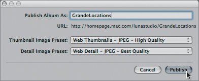 Note If your .Mac account is not already set up, you will be prompted to configure it. It's a good idea to have your account configured before you publish a web journal to it. | 2. | In the dialog that appears, type GrandeLocations in the Publish Album As field.