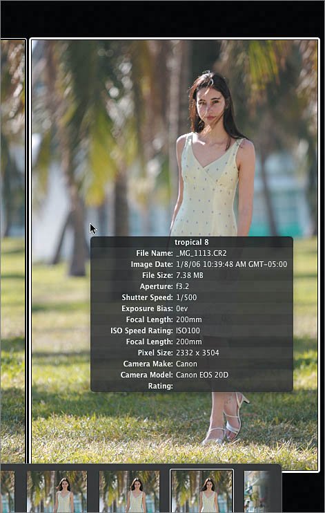 Tip Tools that are in the regular toolbar but not visible on the Full Screen toolbar are still accessible via their usual keyboard shortcuts. | | | 4. | If necessary, press T to display the metadata overlay so that you can see the image filenames. Then, look at the image tropical 8.