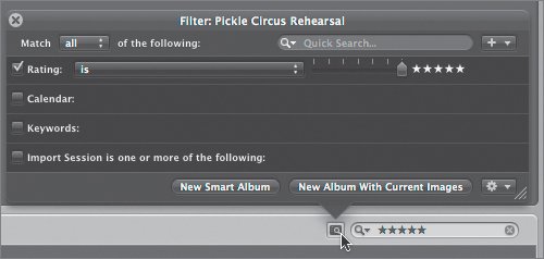 All of your five-star images will appear, regardless of their keywords. You've told Aperture that if an image matches any of your chosen criteria, it should be displayed.