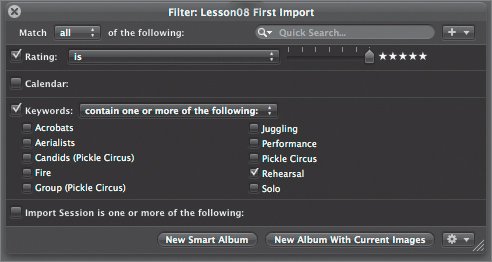 Notice that the Rating box is checked. That's because you already filtered the images by their five-star rating. Let's filter now by keyword.
