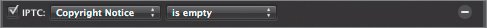 | We could continue, but you get the idea. A common use of the Query HUD is to find images that you need to edit, so often you'll just use it to find five-star images. It's important to note that the Query HUD is not global: It filters only the currently selected item in the Projects panel. Each project in Aperture has its own filter settings, so you can sort one project one way, and then go to another and define completely different filters. When you return to the first project, you'll find your Query HUD settings just as you left them. Aperture's Query HUD is a powerful tool for sifting through your images. The ability to search on any combination of multiple criteria can help you quickly find the images you need. However, good searching depends on having good metadata assigned to your images. If you take the extra time to apply IPTC data, ratings, and keywords, you'll be able to quickly find images shot on specific dates, by specific photographers, of particular events. As your Library grows, this functionality will become increasingly valuable. To help you with your IPTC keywords, Aperture can even find images that lack IPTC metadata. For example, you can search for images that don't have a copyright. In the Query HUD, add an IPTC criterion, and then configure it as follows:  The ability to search for empty fields makes it simple to find images that need additional rating and tagging. Congratulations. You can now consider yourself a pro at stacking, rating, keywording and doing all other tasks related to organizing images in Aperture. It's a lot to digest, but once you do, you'll savor the robust and powerful control that Aperture provides you over your image Library. |