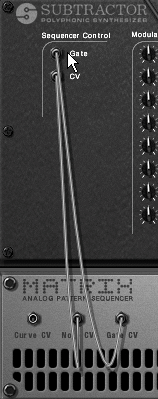 | 2. | From the back panel, the Matrix's Note CV output should be connected to your instrument's CV input, and the Matrix's Gate CV output should be connected to a Gate input (Figure 7.17). If this is not the case, go ahead and connect these manually by clicking and dragging from output to input.