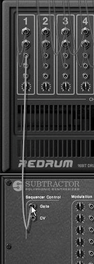 Figure 10.26. Connect a drum channel Gate CV output to a SubTractor to trigger a low-frequency sound (the note CV signal is not needed to make a single tone).