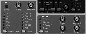 | The SubTractor has two low-frequency oscillators, LFO 1 and LFO 2 (Figure 5.41). These low-frequency oscillators move so slowly that they don't make tones. Rather, they superimpose slow-moving waves over high-frequency ones to change their behavior. You can create vibrato by generating a very low-frequency wave and sending it to an oscillator's pitch. The result is as if the oscillator were poised on an ocean wave, making it go from high to low. Figure 5.41. The low-frequency oscillators LFO 1 and LFO 2