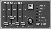 The mod envelope also depends on the amp envelope for signals, just as the filter envelope does. If the amp envelope release is off, there won't be an audible release stage for the modulation envelope, either. To pitch-modulate Osc 1 with the mod envelope's attack 1. | Save any settings you may want to keep, and load the test patch.