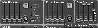 | 2. | Set all the mod envelope faders to 0, and set the amp envelope release fader to 82 (Figure 5.53). This gives your mod envelope the stages it needs for this demonstration.