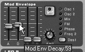 | Tip Short-duration mod envelope effects sometimes behave strangely. For example, when running your bass line with the mod envelope set to Osc 1, your decay fader alone can seem to be doing three different things. To use the mod envelope's decay stage on short notes 1. | Set up your Sequencer to play your bass line.