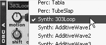 | 2. | Select the Synth:303Loop waveform for Osc A, using the arrow buttons or by right-clicking on the oscillator's waveform display (Figure 5.93).