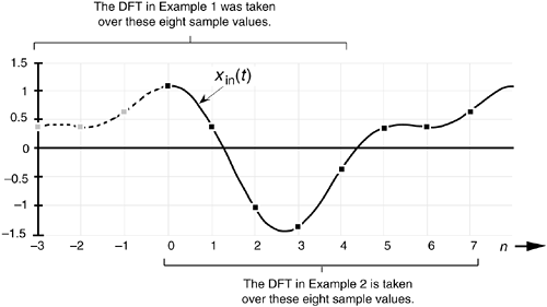 Equation (3-19) tells us that, if the point where we start sampling x(n) is shifted to the right by k samples, the DFT output spectrum of Xshifted(m) is X(m) with each of X(m)'s complex terms multiplied by the linear phase shift ej2pkm/N, which is merely a phase shift of 2pkm/N radians or 360km/N degrees. Conversely, if the point where we start sampling x(n) is shifted to the left by k samples, the spectrum of Xshifted(m) is X(m) multiplied by e–j2pkm/N. Let's illustrate Eq. (3-19) with an example.