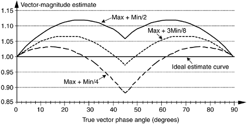 One thing to keep in mind. Because the various |V| estimations can exceed the correct normalized vector magnitude value, i.e., some magnitude estimates are greater than one. This means that although the correct magnitude value may be within the system's full-scale word width, an algorithm result may exceed the word width of the system and cause overflow errors. With aMax+bMin algorithms the user must be certain that no true vector magnitude exceeds the value that will produce an estimated magnitude greater than the maximum allowable word width.