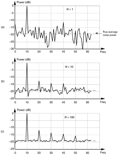 Figure 11-4. Results of averaging signal tones plus noise-power spectra: (a) no averaging, N = 1; (b) N = 10; (c) N = 100.