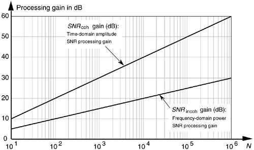 Figure 11-5. Time-domain amplitude SNR processing gain from Eq. (11-14), and the frequency-domain power SNR processing gain from Eq. (11-17), as functions of N.