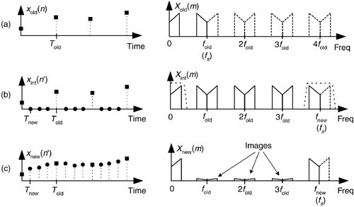 Is that all there is to zero stuffing, interpolation, and filtering? Well, not quite—because we can't implement an ideal lowpass filter, xnew(n') will not be an exact interpolation of xold(n). The error manifests itself as the residual images within Xnew(m). With an ideal filter, these images would not exist. We can only approximate an ideal lowpass interpolation filter. The issue to remember is that the accuracy of our entire interpolation process depends on the stopband attenuation of our lowpass interpolation filter. The lower the attenuation, the more accurate the interpolation. As with decimation, interpolation can be thought of as an exercise in lowpass filter design.