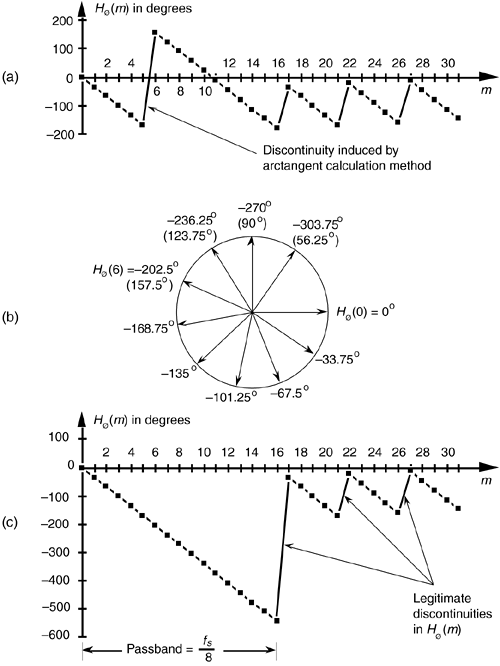 The phase response in Figure 5-35(a) certainly looks linear over selected frequency ranges, but what do we make of those sudden jumps, or discontinuities, in this phase response? If we were to plot the angles of Hø(m) starting with the m = 0 sample on a polar graph, using the nonzero real part of H(0), and the zero-valued imaginary part of H(0), we'd get the zero-angled Hø(0) phasor shown on the right side of Figure 5-35(b). Continuing to use the real and imaginary parts of H(m) to plot additional phase angles results in the phasors going clockwise around the circle in increments of –33.75°. It's at the Hø(6) that we discover the cause of the first discontinuity in Figure 5-35(a). Taking the real and imaginary parts of H(6), we'd plot our phasor oriented at an angle of –202.5°. But Figure 5-35(a) shows that Hø(6) is equal to 157.5°. The problem lies in the software routine used to generate the arctangent values plotted in Figure 5-35(a). The software adds 360° to any negative angles in the range of –180° > ø