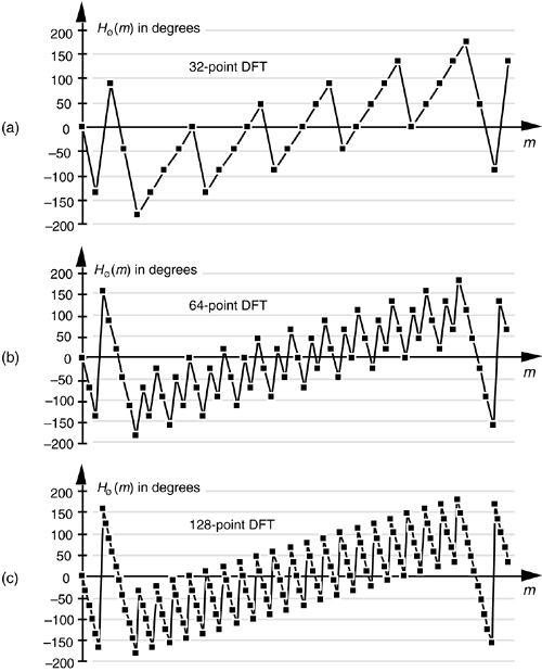 Although we used a 128-point DFT to obtain the frequency responses in Figures 5-34 and 5-35, we could just as well have used N = 32-point or N = 64-point DFTs. These smaller DFTs give us the phase response curves shown in Figure 5-36(a) and 5-36(b). Notice how different the phase response curves are when N = 32 in Figure 5-36(a) compared to when N = 128 in Figure 5-36(c). The phase angle resolution is much finer in Figure 5-36(c). The passband phase angle resolution, or increment Dø, is given by