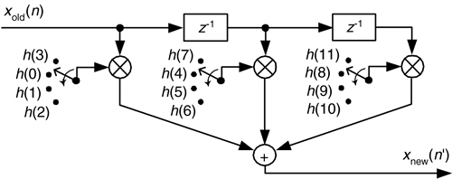 In the general case, if our polyphase filter is interpolating by a factor of M, then we'll have M sub-filters. A minimum-storage structure for the polyphase filter is shown in Figure 10-11, where three commutators rotate (in unison) counterclockwise through four sets of filter coefficients upon the arrival of each new xold(n) sample. Again, four xnew(n') samples are calculated for each xold(n) sample.