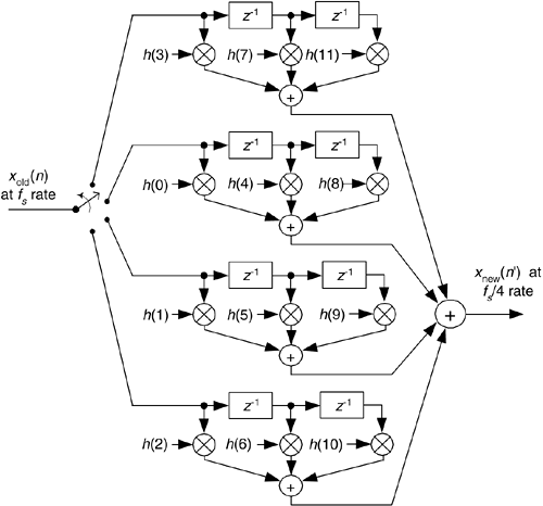 Figure 10-10. Polyphase interpolation-by-four filter structure as a bank of FIR sub-filters.