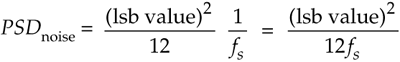 In our world of discrete systems, the flat noise spectrum assumption results in the total quantization noise (a fixed value based on the converter's lsb voltage) being distributed equally in the frequency domain, from –fs/2 to +fs/2 as indicated in Figure 13-17. The amplitude of this quantization noise PSD is the rectangle area (total quantization noise power) divided by the rectangle width (fs), or