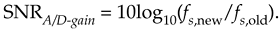 For example: if fs,old = 100 kHz, and fs,new = 400 kHz, the SNRA/D-gain = 10log10(4) = 6.02 dB. Thus oversampling by a factor of 4 (and filtering), we gain a single bit's worth of quantization noise reduction. Consequently we can achieve N+1-bit performance from an N-bit A/D converter, because we gain signal amplitude resolution at the expense of higher sampling speed. After digital filtering, we can decimate to the lower fs,old without degrading the improved SNR. Of course, the number of bits used for the lowpass filter's coefficients and registers must exceed the original number of A/D converter bits, or this oversampling scheme doesn't work.