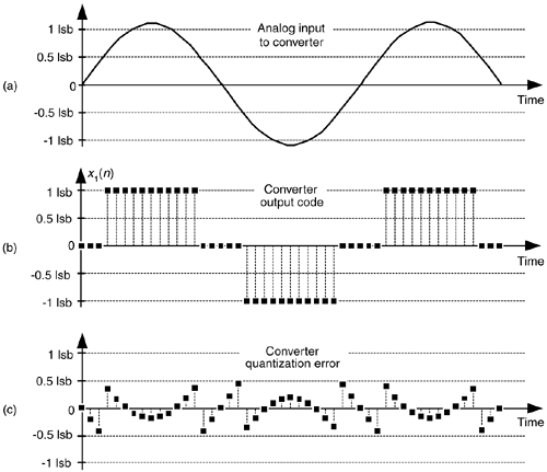 Dithering, another technique used to minimize the effects of A/D quantization noise, is the process of adding noise to our analog signal prior to A/D conversion. This scheme, which doesn't seem at all like a good idea, can indeed be useful and is easily illustrated with an example. Consider digitizing the low-level analog sinusoid shown in Figure 13-19(a), whose peak voltage just exceeds a single A/D converter least significant bit (lsb) voltage level, yielding the converter output x1(n) samples in Figure 13-19(b). The x1(n) output sequence is clipped. This generates all sorts of spectral harmonics. Another way to explain the spectral harmonics is to recognize the periodicity of the quantization noise in Figure 13-19(c).