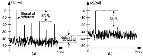 Figure 13-20. Spectra of a low-level discrete sinusoid: (a) with no dithering; (b) with dithering.