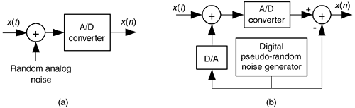 The standard implementation of dithering is shown in Figure 13-21(a). The typical amount of random wideband analog noise used in the this process, provided by a noise diode or noise generator ICs, has a rms level equivalent to 1/3 to 1 lsb voltage level.