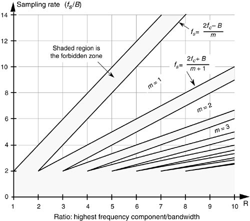 Figure 2-10 has been prominent in the literature, but its normal presentation enables the reader to jump to the false conclusion that any sample rate above the minimum shown in the figure will be an acceptable sample rate[6–12]. There's a clever way to avoid any misunderstanding[13]. If we plot the acceptable ranges of bandpass sample frequencies from Eq. (2-10) as a function of R we get the depiction shown in Figure 2-11. As we saw from Eq. (2-10), Table 2-1, and Figure 2-9, acceptable bandpass sample rates are a series of frequency ranges separated by unacceptable ranges of sample rate frequencies, that is, an acceptable bandpass sample frequency must be above the minimum shown in Figure 2-10, but cannot be just any frequency above that minimum. The shaded region in Figure 2-11 shows those normalized bandpass sample rates that will lead to spectral aliasing. Sample rates within the white regions of Figure 2-11 are acceptable. So, for bandpass sampling, we want our sample rate to be in the white wedged areas associated with some value of m from Eq. (2-10). Let's understand the significance of Figure 2-11 by again using our previous bandpass signal example from Figure 2-7.