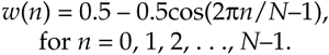 ] In the literature, the equations for window functions depend on the range of the sample index n. We define n to be in the range 0 < n < N–1. Some authors define n to be in the range –N/2 < n < N/2, in which case, for example, the expression for the Hanning window would have a sign change and be w(n) = 0.5 + 0.5cos(2pn/N–1).