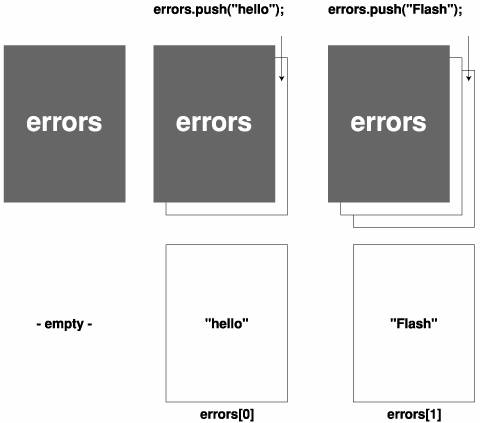 If either of the conditions in the statement exists, data has been input improperly. As a result, the actions within the if statement are executed. The first action within the statement uses the push() method of the Array instance to add an element to the end of the errors array. (This element is what's enclosed in the parentheses.) If you think of the errors array as a book, using the push() method is like adding a page to the end of the book, with the string within the parentheses representing the text on that page. The page number of this page would be its index position within the array.